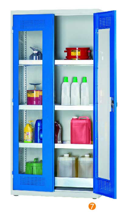 用于污染液體的存儲(chǔ),可調(diào)式隔板,上下25mm可調(diào) 可移動(dòng)式底部貯存盤高100mm,無縫焊接,更好防泄漏 門板的頂部及底部帶通風(fēng)孔,自然通風(fēng),門開啟角度12。 隔板/貯存盤式層板每層最大承重60KG (可抽出式除外) 柜體最大承重承重:300KG