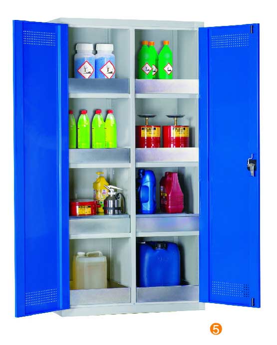 用于污染液體的存儲,可調(diào)式隔板,上下25mm可調(diào) 可移動式底部貯存盤高100mm,無縫焊接,更好防泄漏 門板的頂部及底部帶通風(fēng)孔,自然通風(fēng),門開啟角度12。 隔板/貯存盤式層板每層最大承重60KG (可抽出式除外) 柜體最大承重承重:300KG